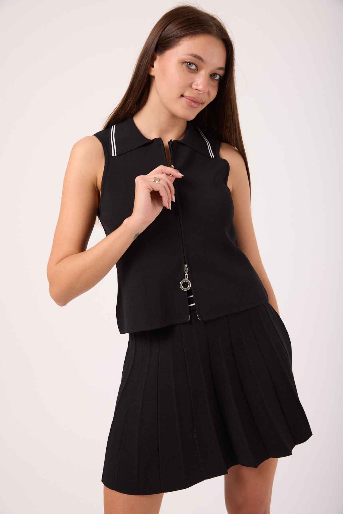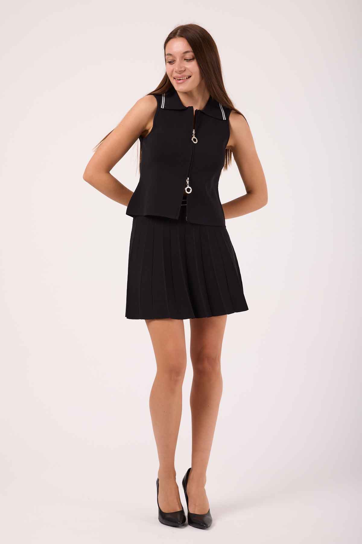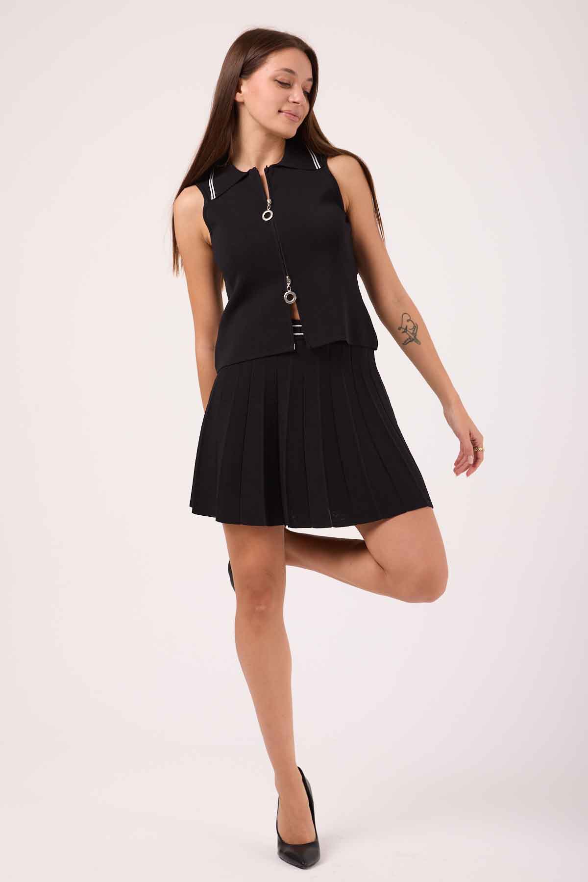 Triko Pileli Etek ve Fermuarlı Yelek Takım (Siyah)