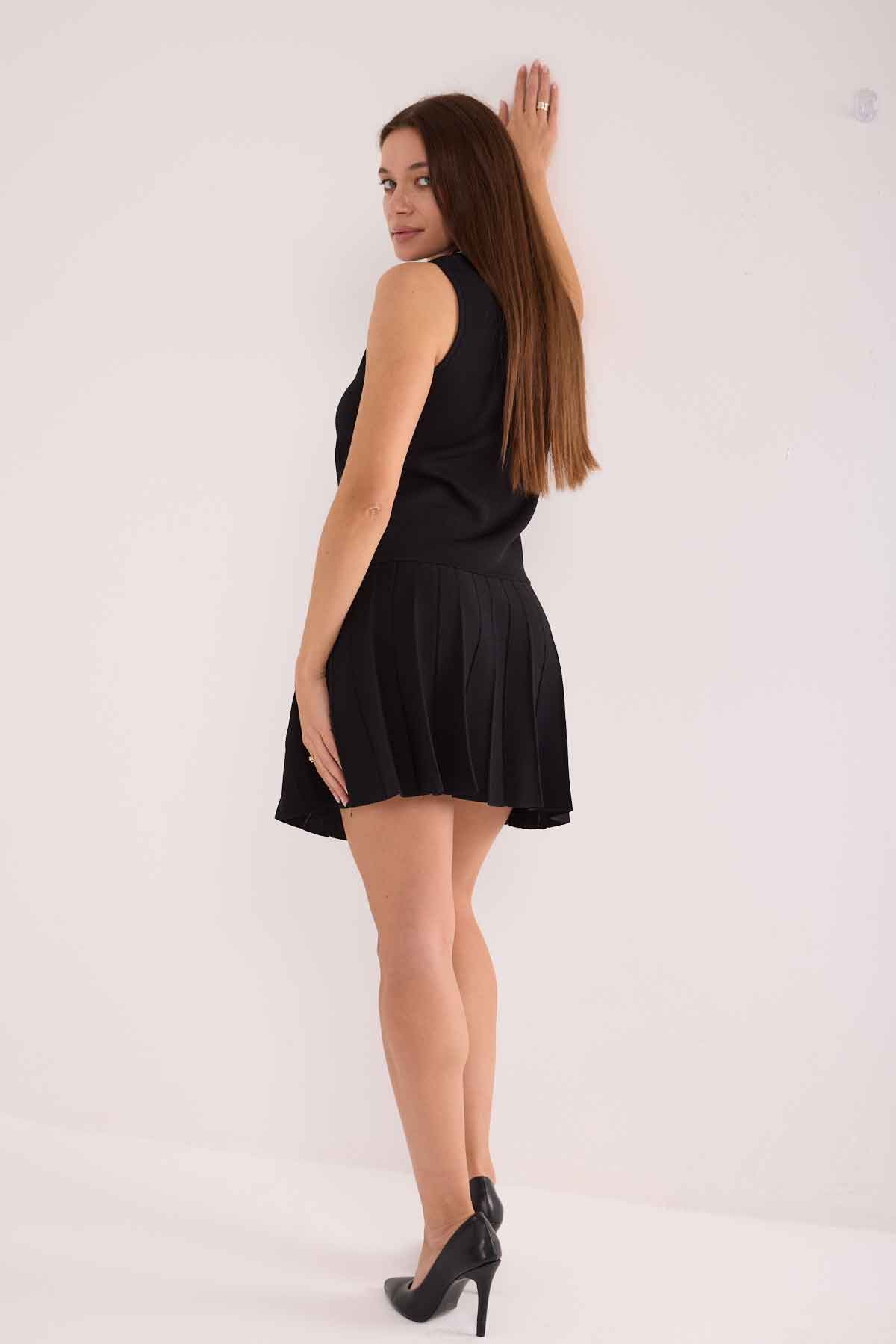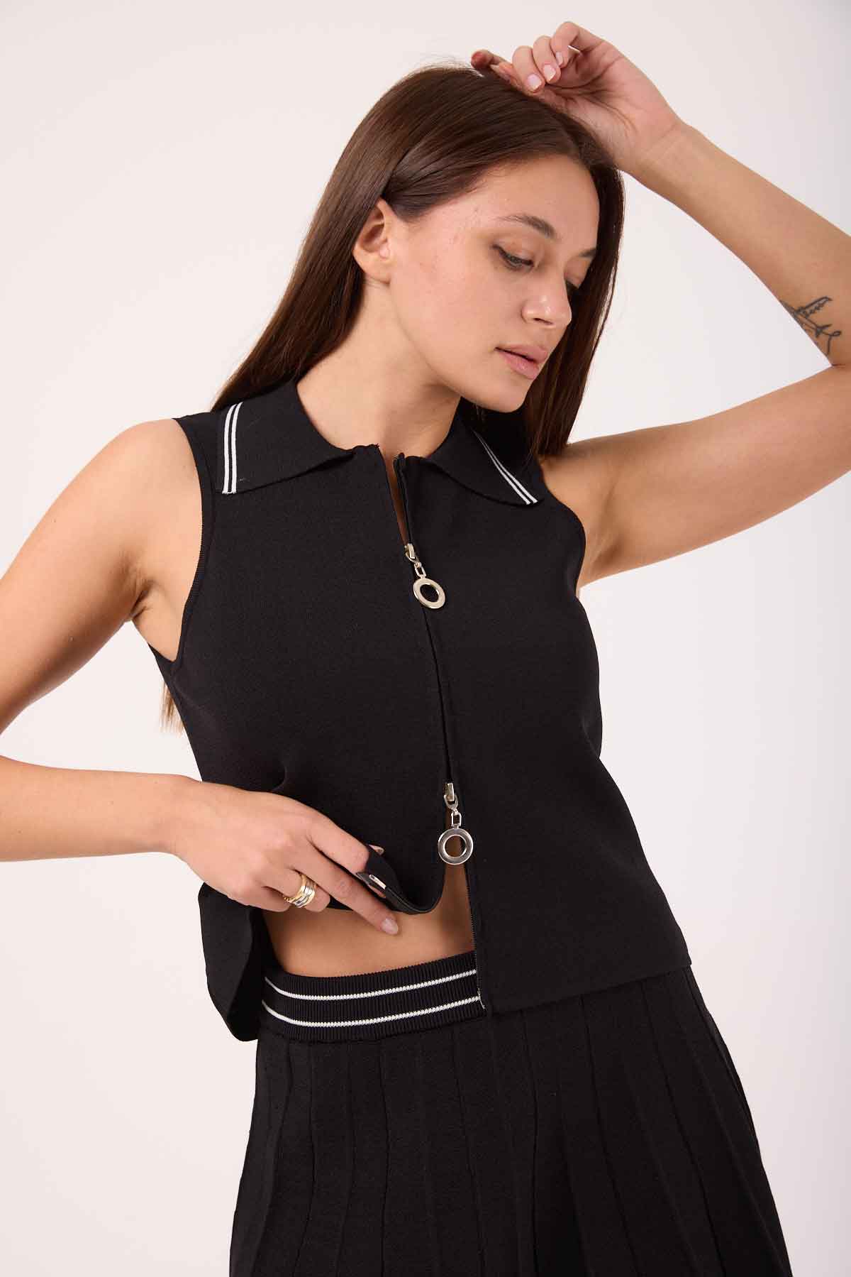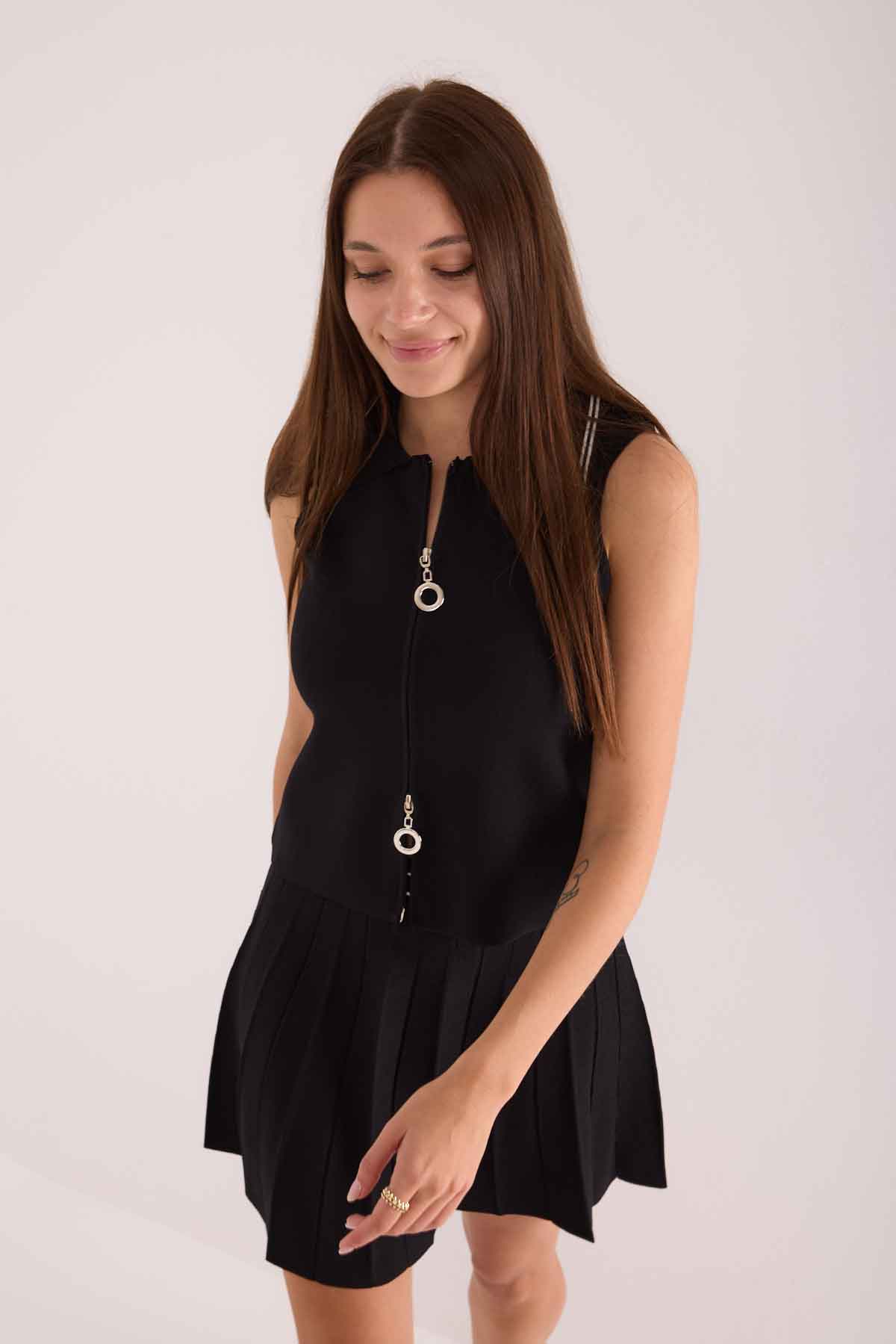 Triko Pileli Etek ve Fermuarlı Yelek Takım (Siyah)