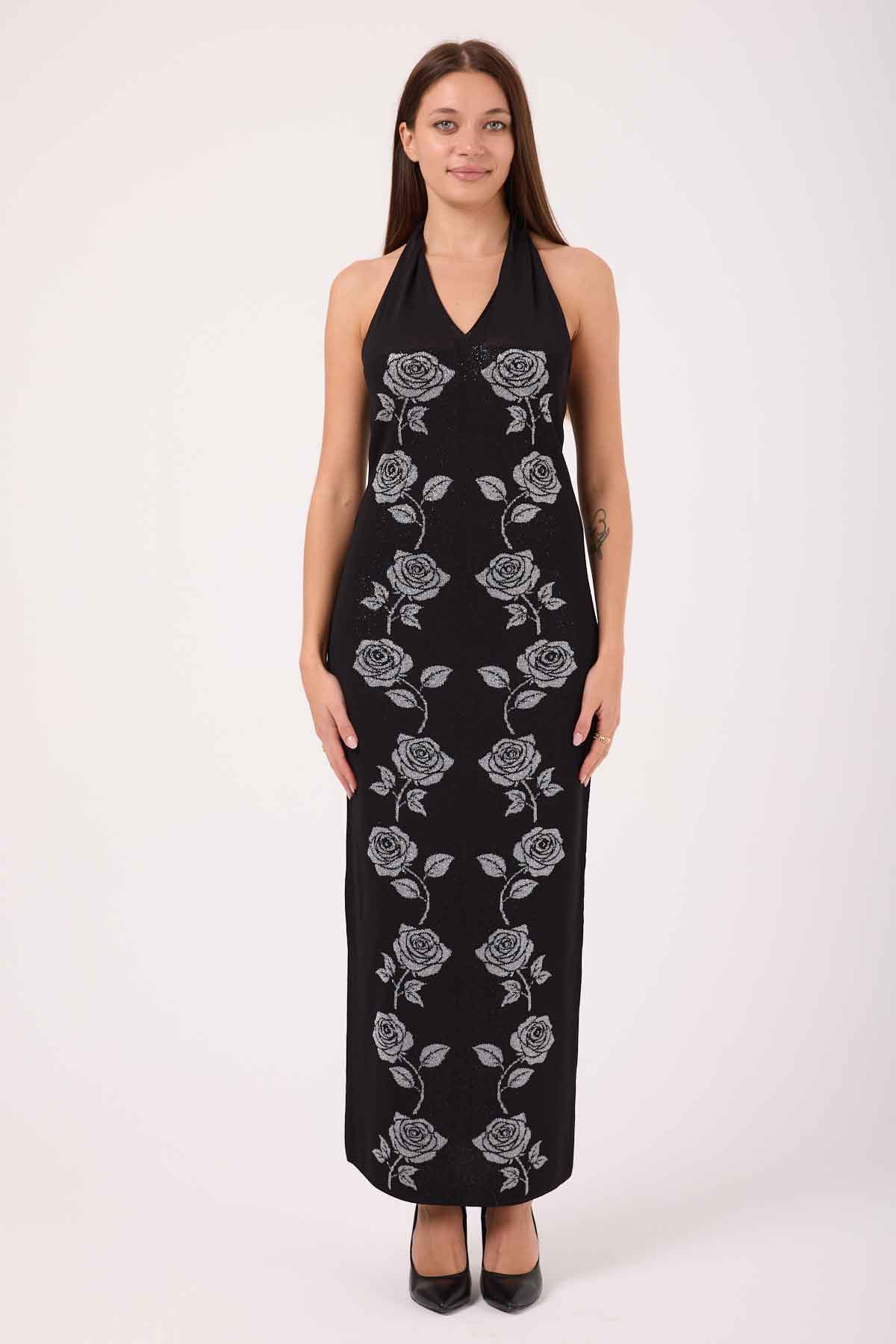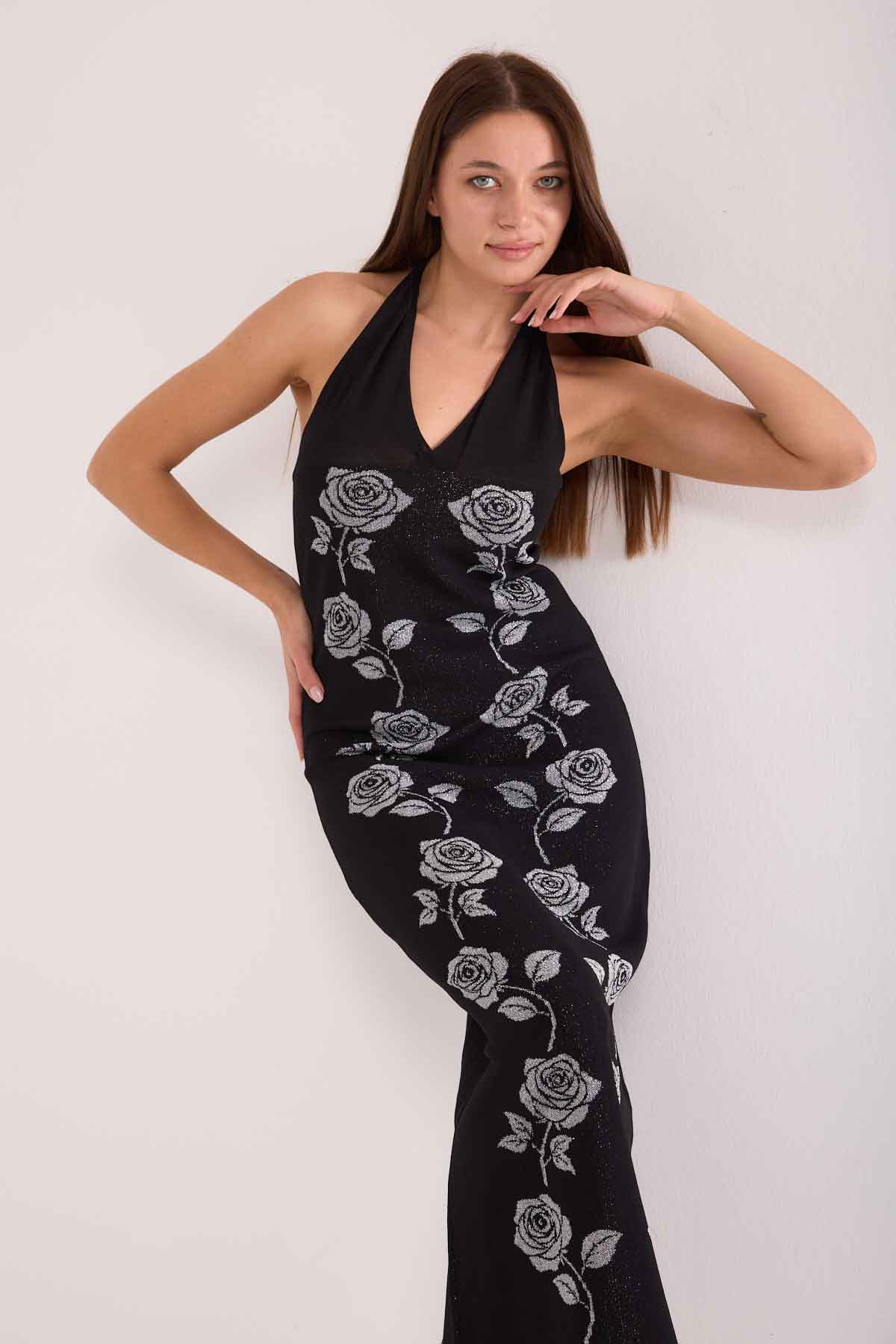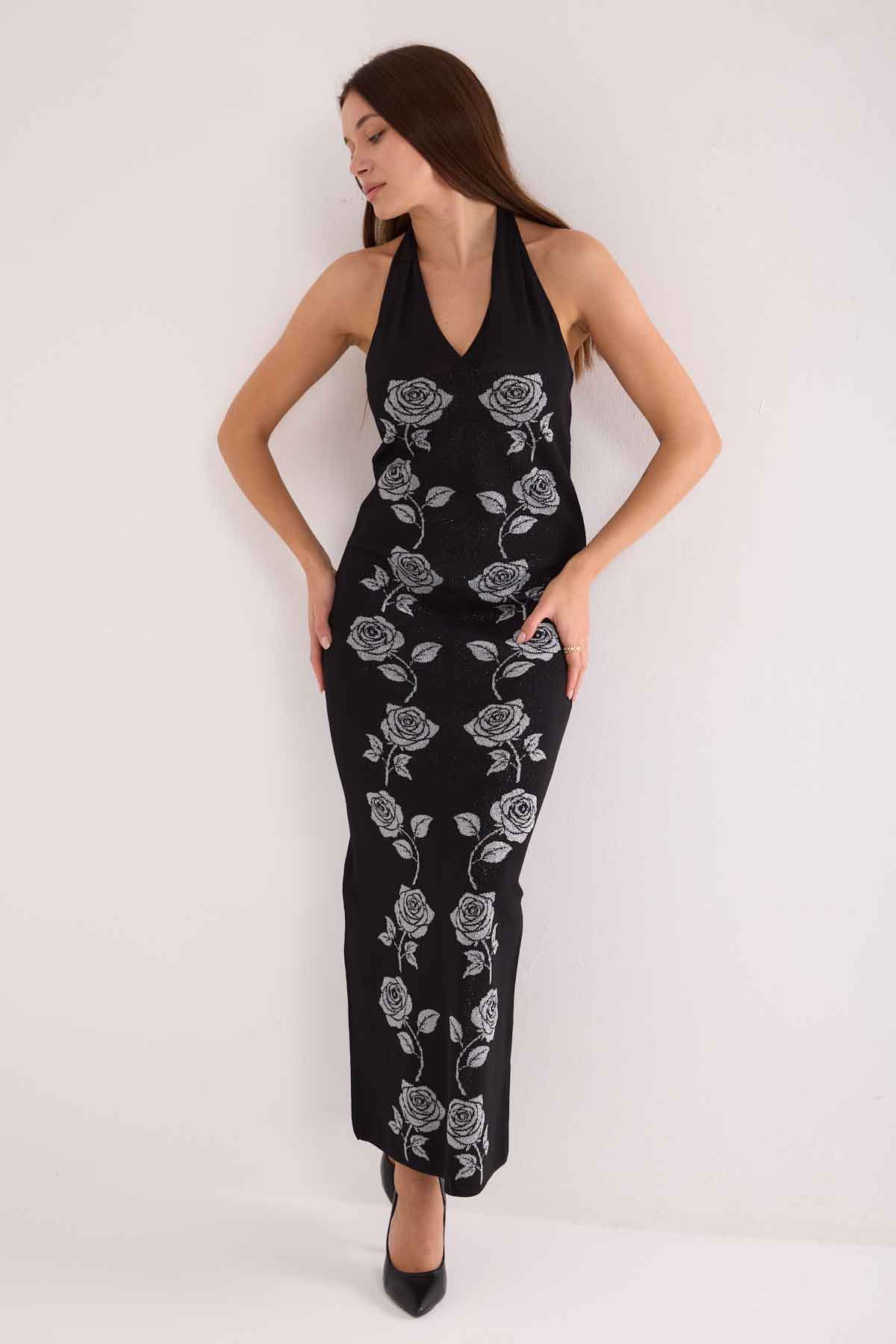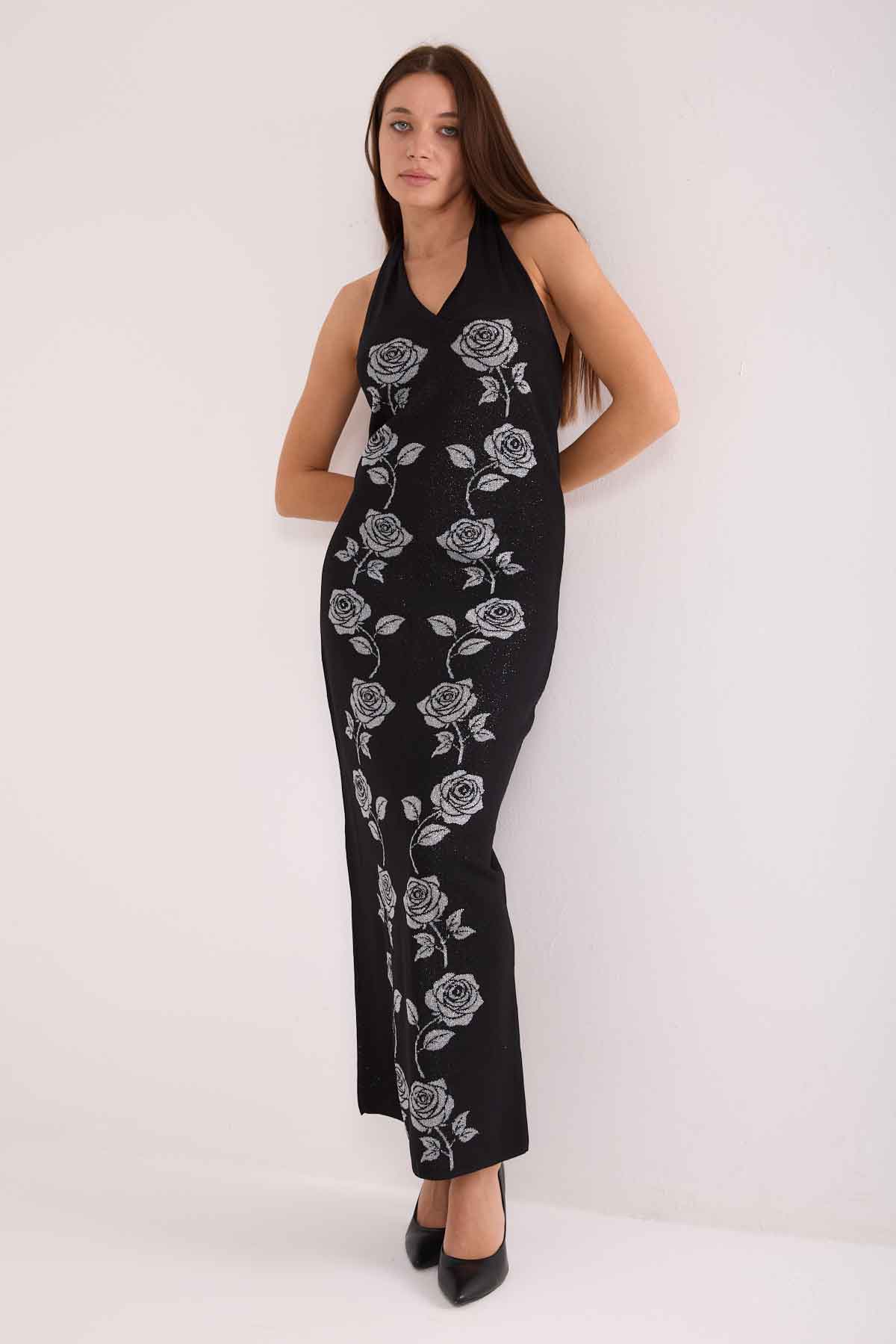 26504 - Triko Rayon İplik Çiçek Desenli Uzun Sırtı Açık Arkadan Bağlamalı Yılbaşı Simli Kokteyl Elbise