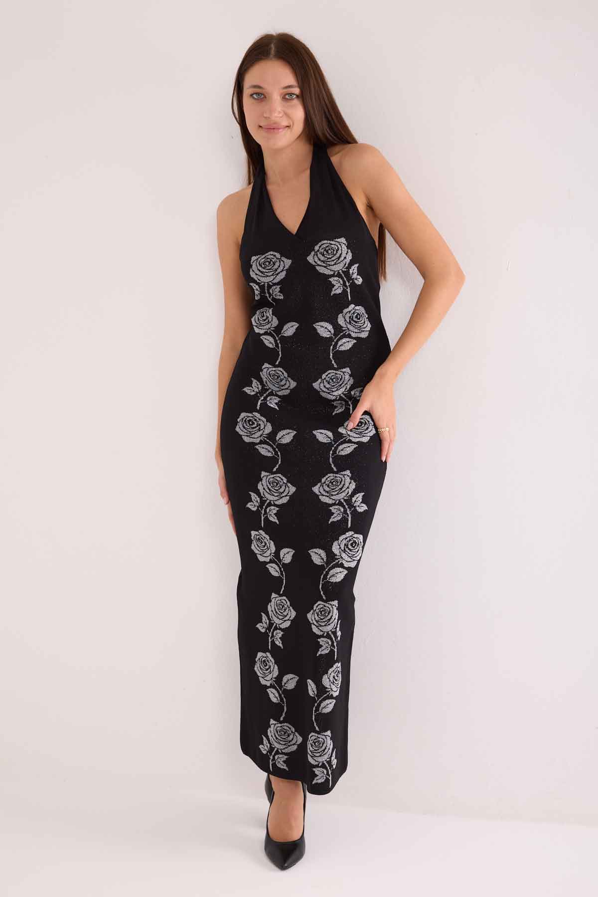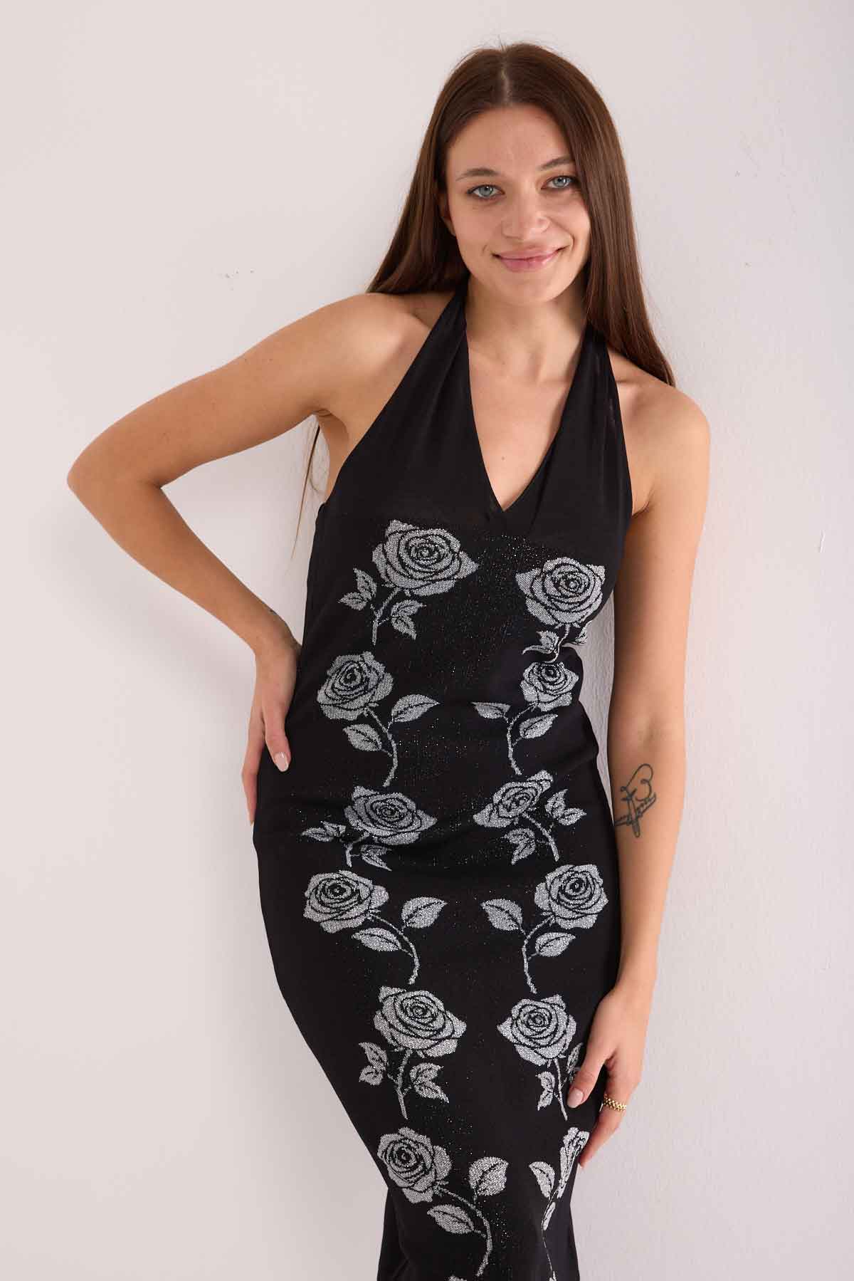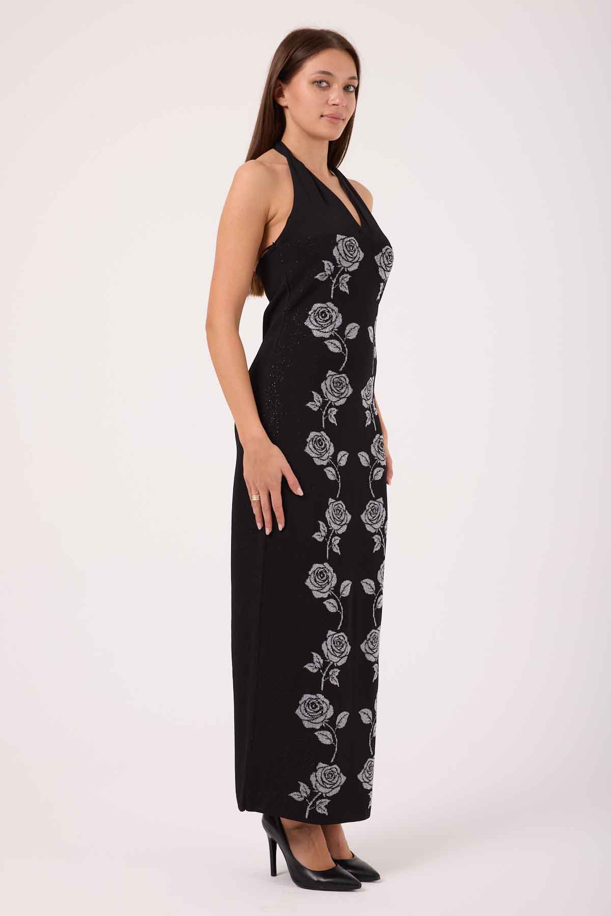 26504 - Triko Rayon İplik Çiçek Desenli Uzun Sırtı Açık Arkadan Bağlamalı Yılbaşı Simli Kokteyl Elbise