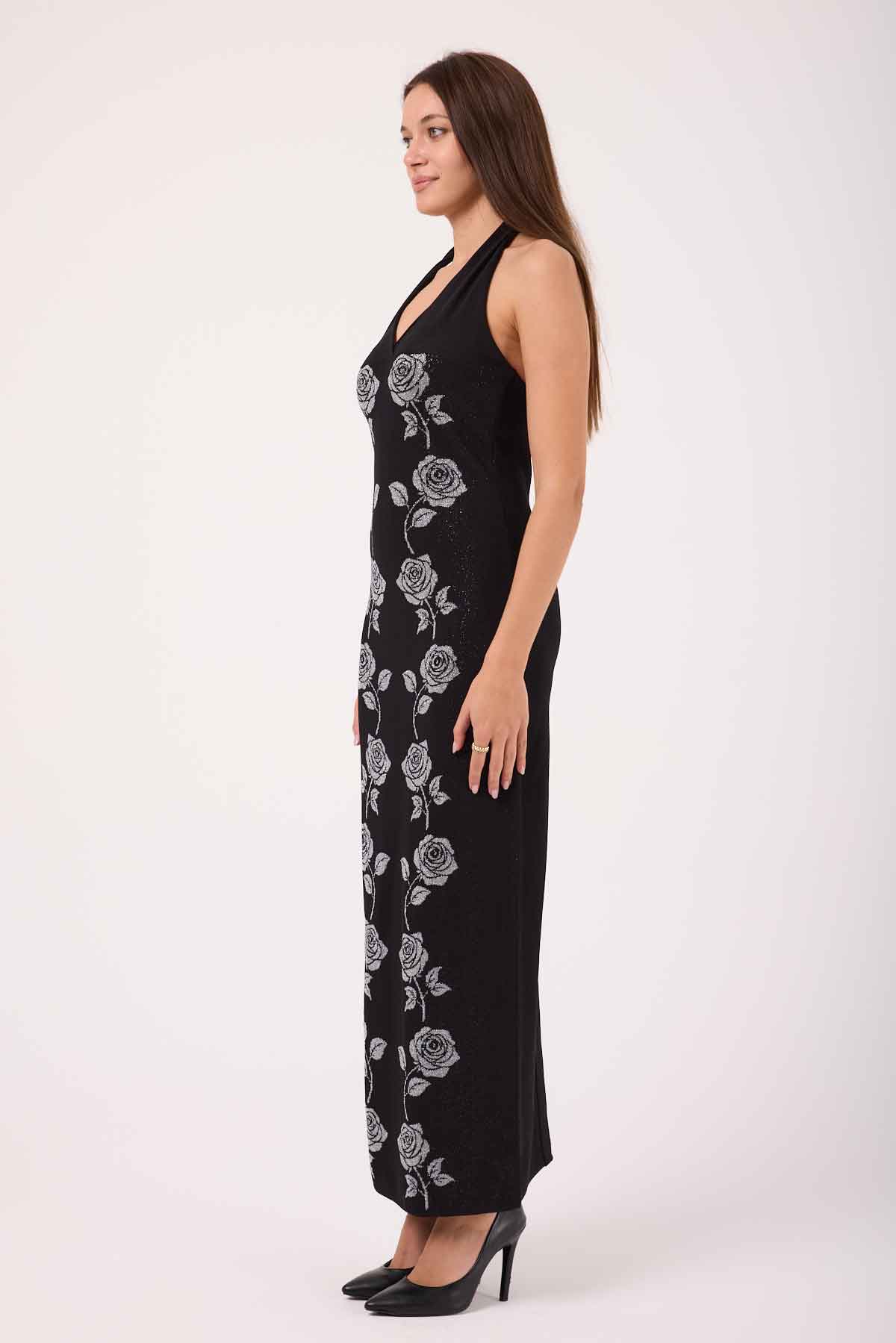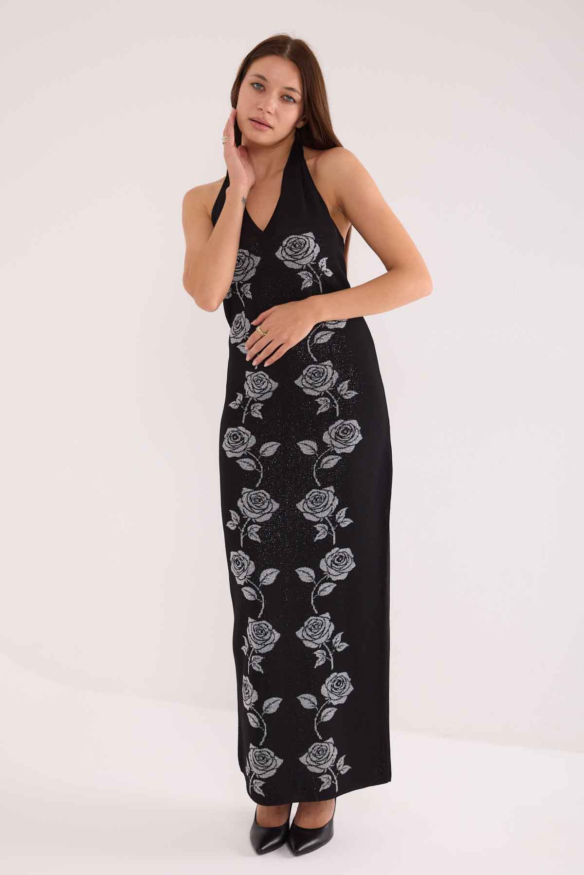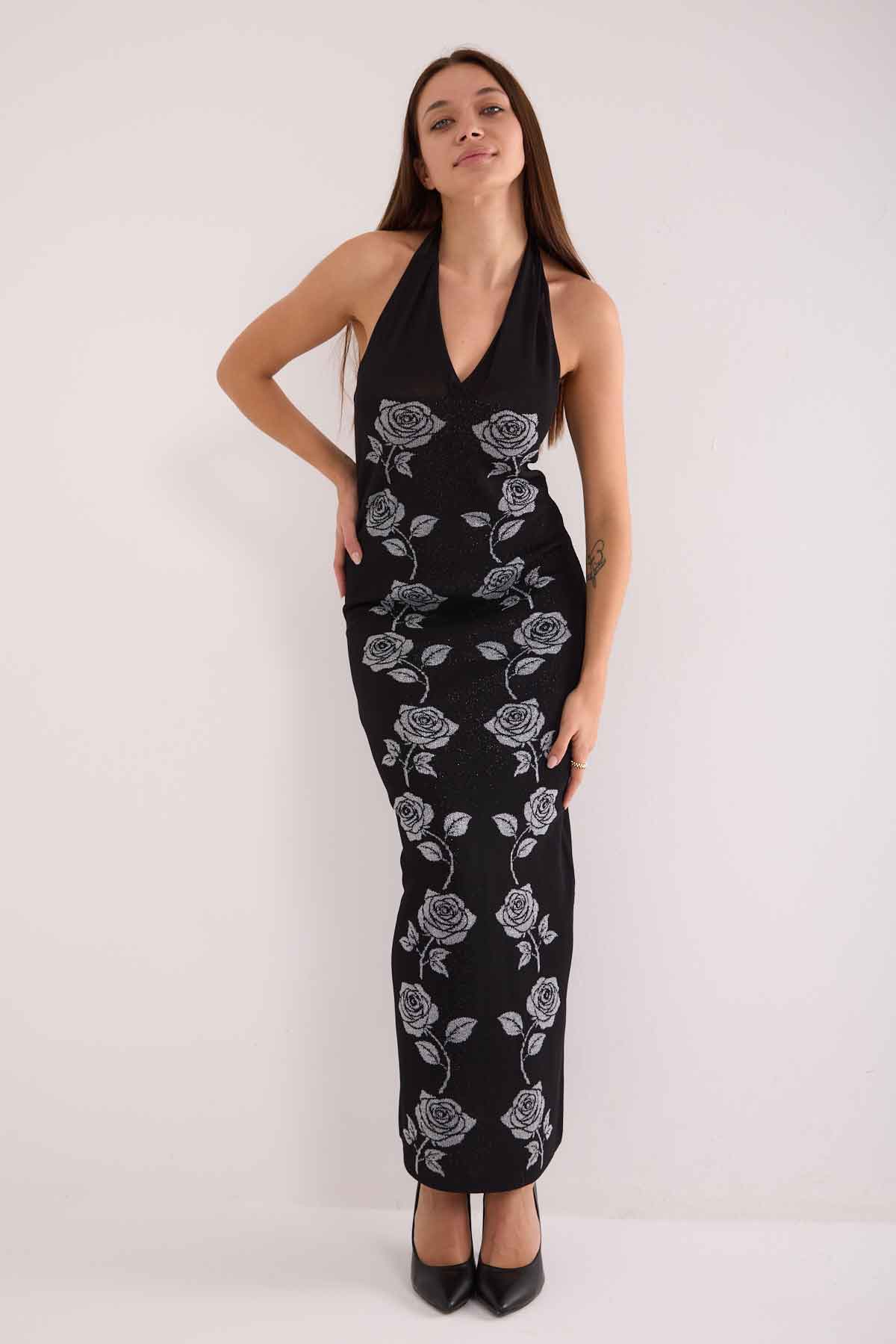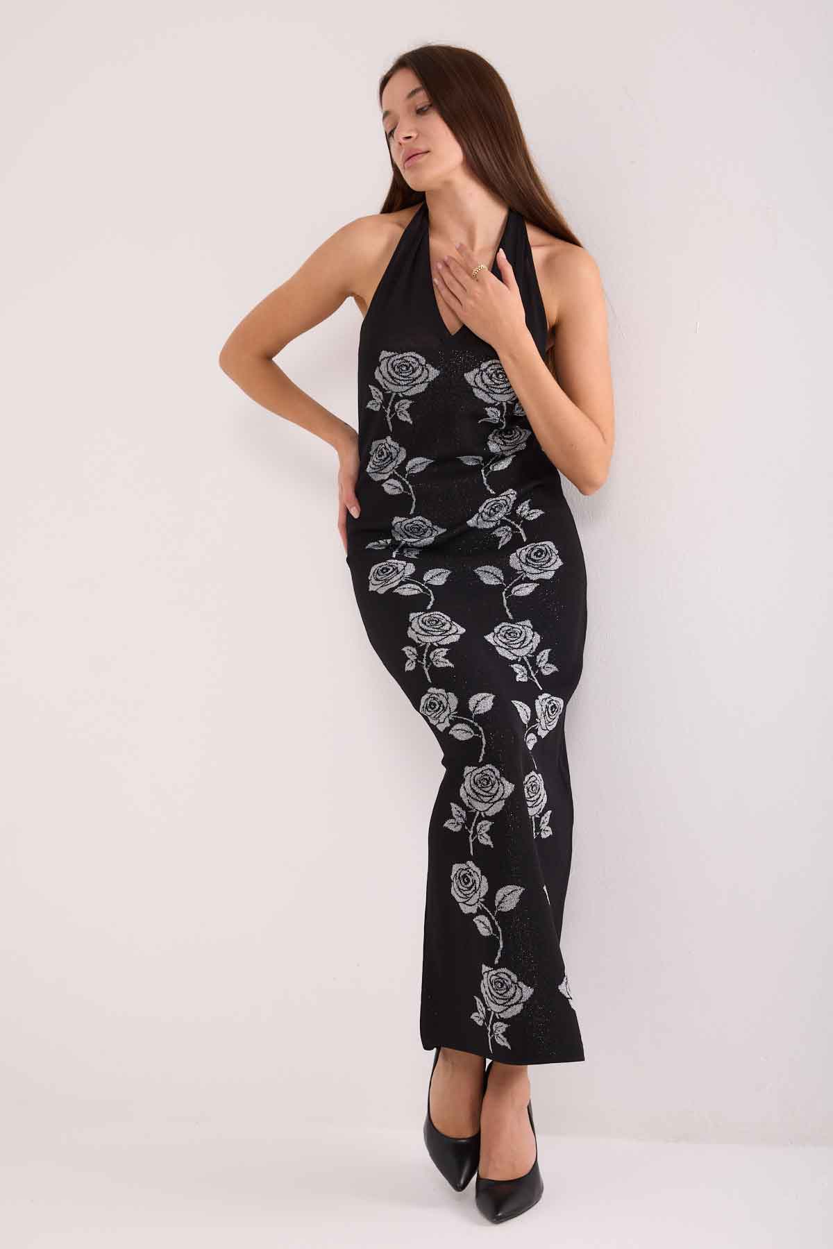 26504 - Triko Rayon İplik Çiçek Desenli Uzun Sırtı Açık Arkadan Bağlamalı Yılbaşı Simli Kokteyl Elbise