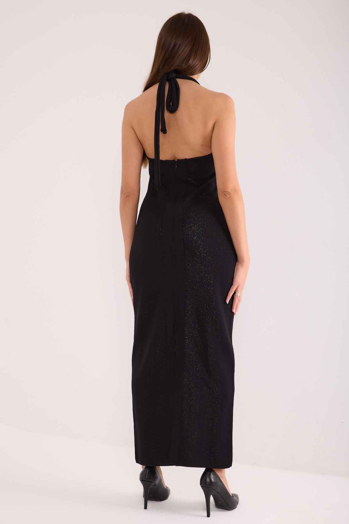 Çarpıcı Sırt Dekoltesi: Uzun kesimi dengeleyen derin sırtı açık detayı, feminen ve cüretkar bir silüet yaratır. Arkadan bağlamalı detayı sayesinde vücudunuza tam oturur ve ayarlanabilirlik sağlar.