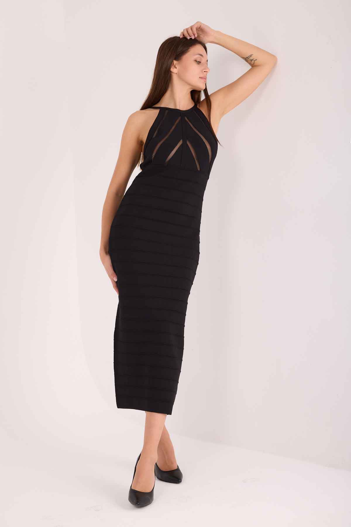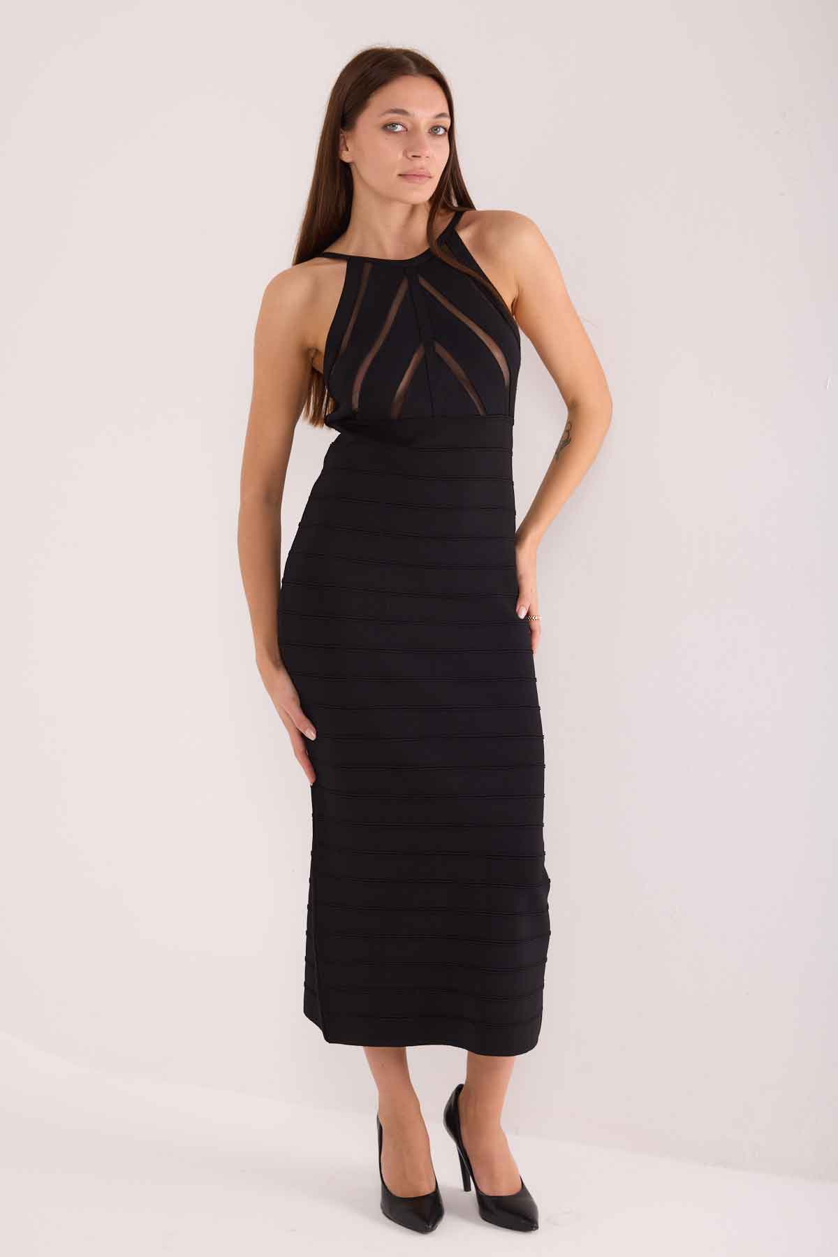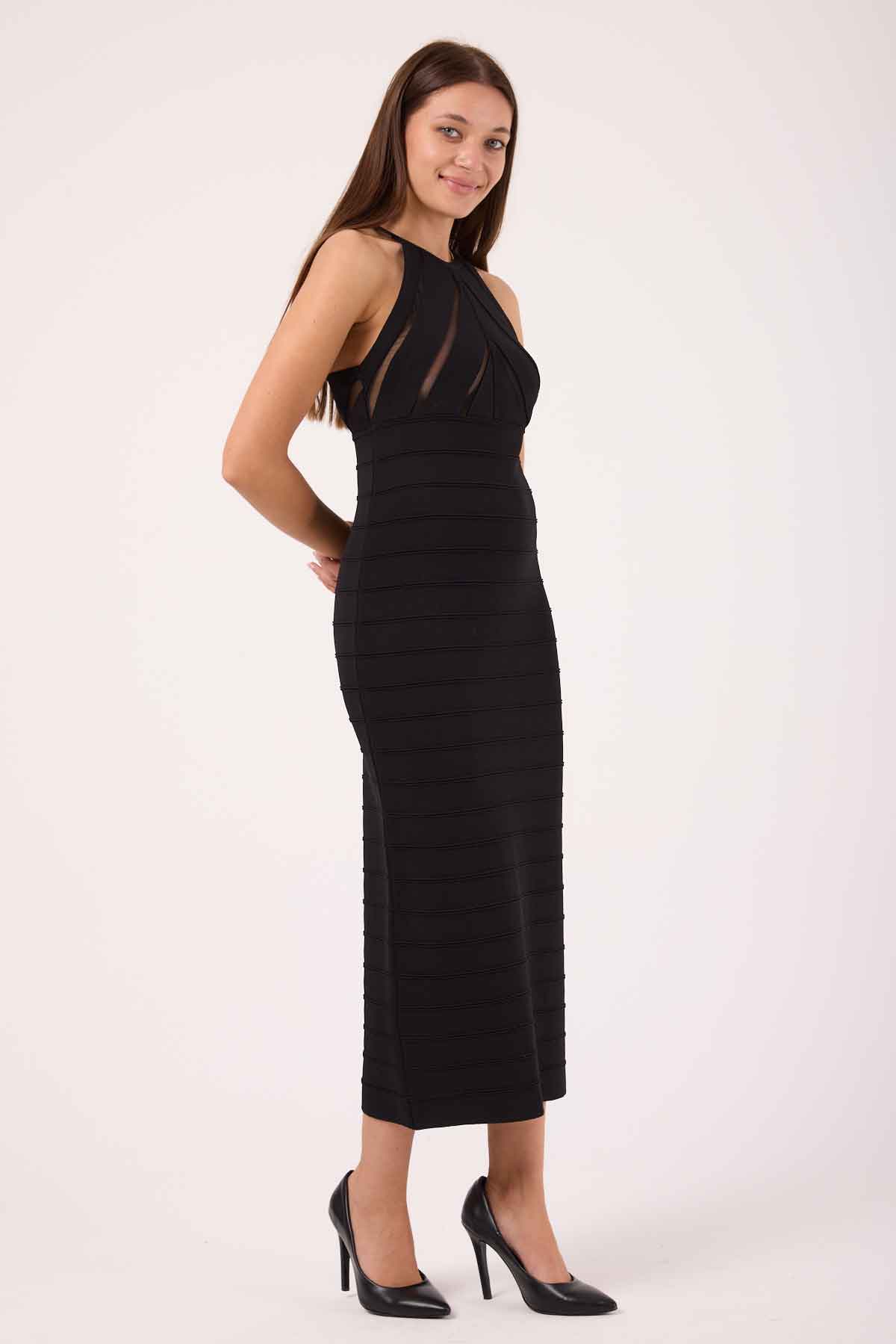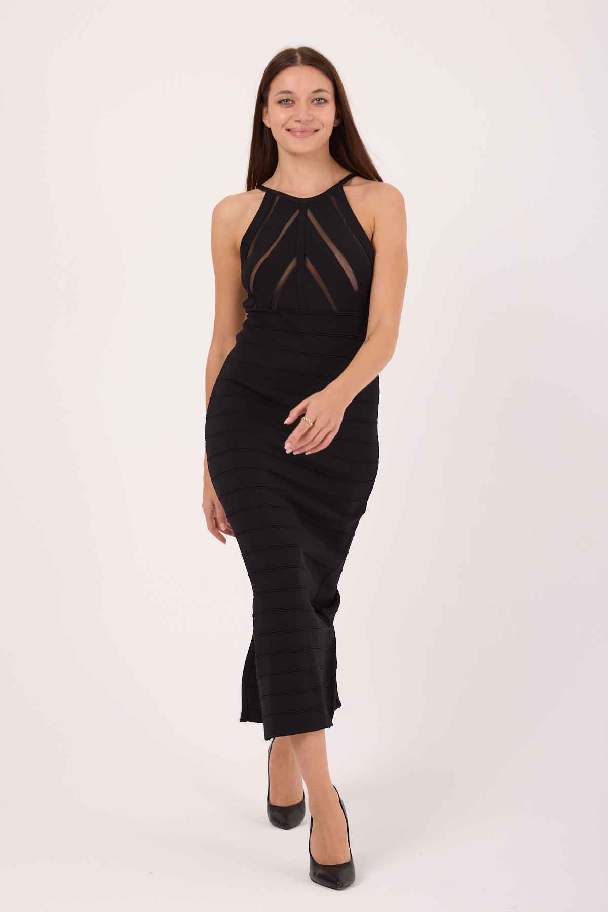 26509 - Triko Rayon İplik Tül Garnili Uzun Arkadan Bağlamalı Askılı Kokteyl Dekolte Elbise
