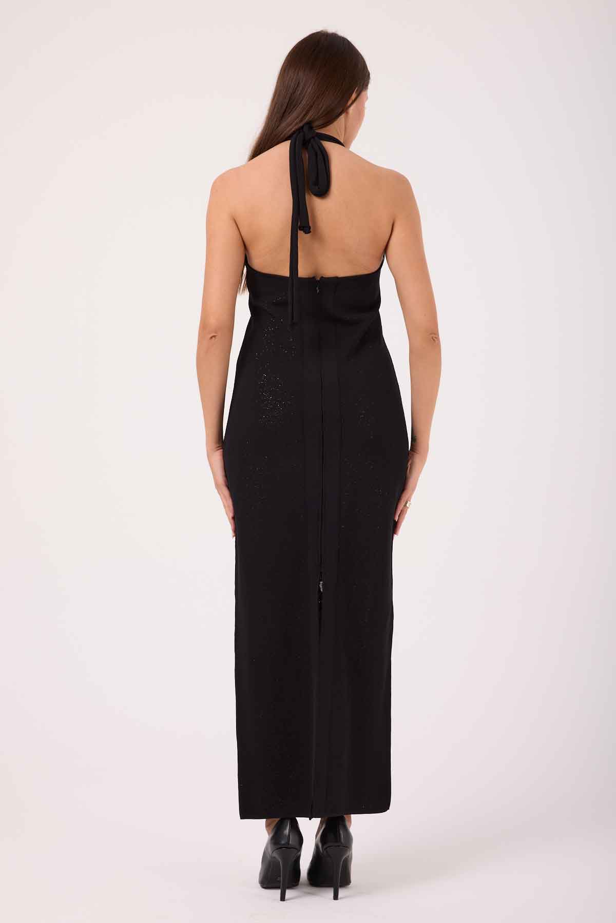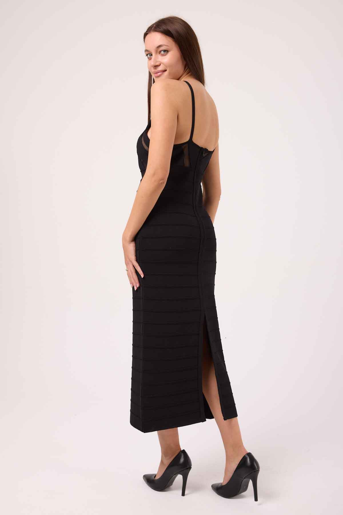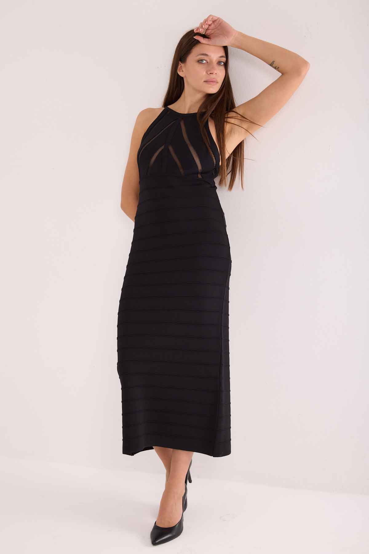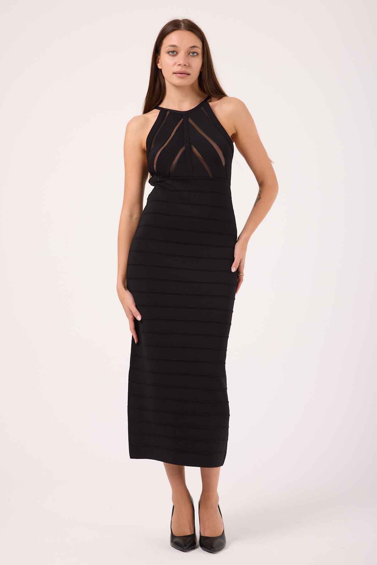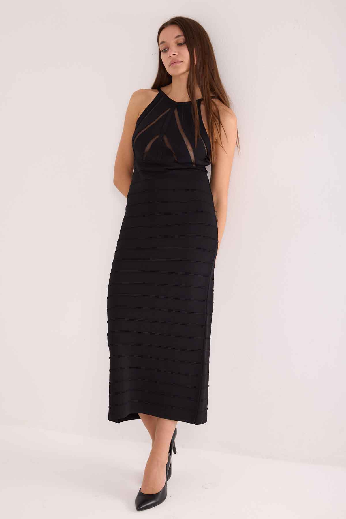 26509 - Triko Rayon İplik Tül Garnili Uzun Arkadan Bağlamalı Askılı Kokteyl Dekolte Elbise